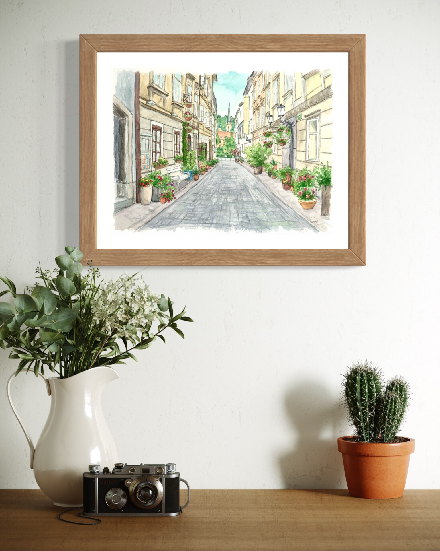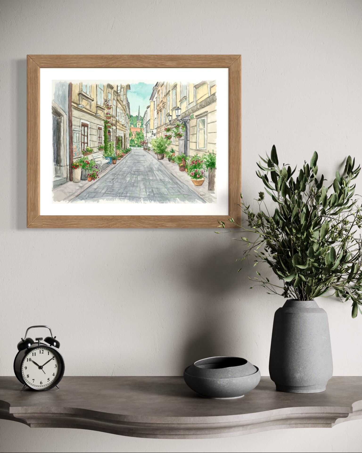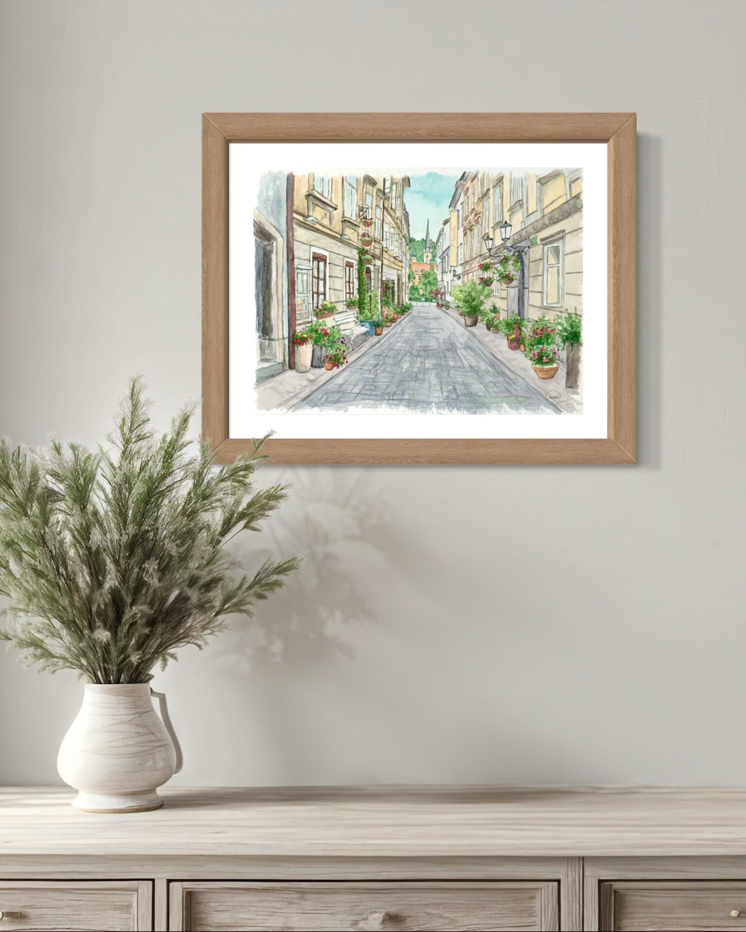 Cvetlična ulica v Ljubljani – umetniški tisk v akvarelu | Evropska ulična stenska umetnost | Domiselna dekoracija, navdihnjena s potovanji | Nežen nevtralen mestni motiv